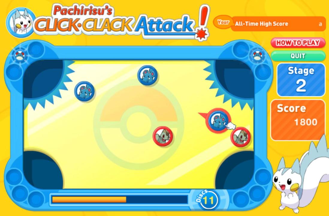 Pachirisu's Click-Clack Attack! was a Flash game on Pokémon.com. The player must send Pokémon discs into holes located at each of the four corners of the board to earn points. Which direction and the distance the discs are launched depends on the angle and force they are launched at. Each disc depicts a Pokémon. While these discs can be sent directly into the holes, if they hit another Pokémon disc in their evolutionary line, they will fuse together and evolve. If they hit an unrelated Pokémon, they will simply collide and knock each other back. There are also special rounds where certain conditions must be met, such as getting all the discs into the holes in one shot.