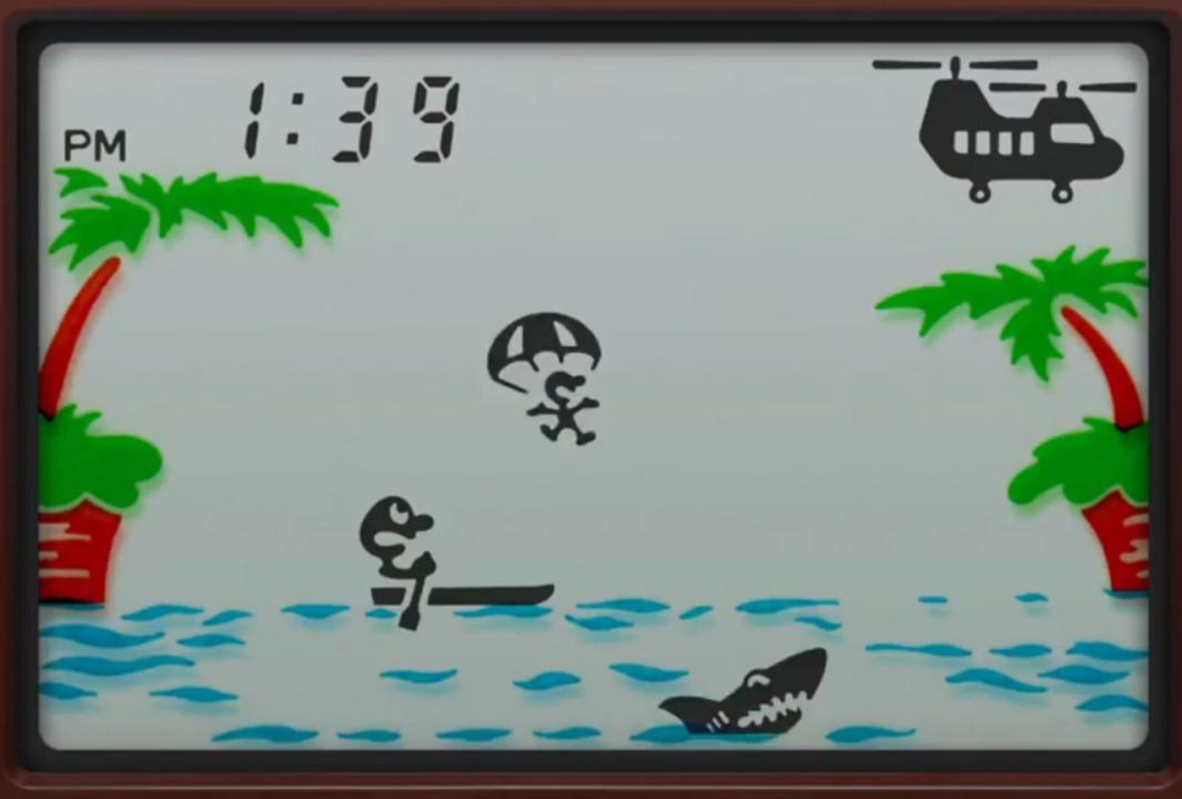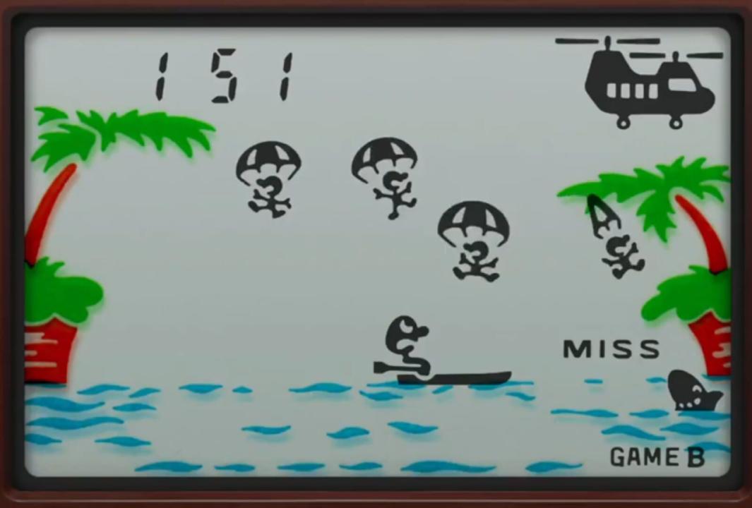 Parachute is a game for the Game & Watch where you have to save people from a helicopter and make them land in your boat. You will direct your boat under the person try and let them land safely. If they land in the water, a shark will come and eat them- if this happens three times you will lose and will have to start over.