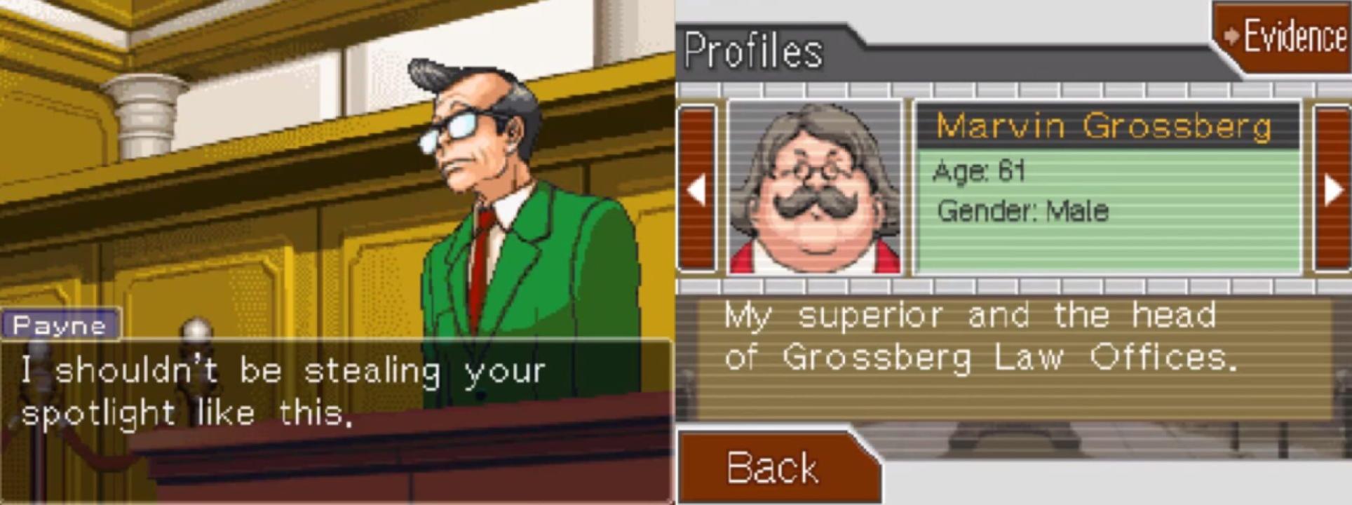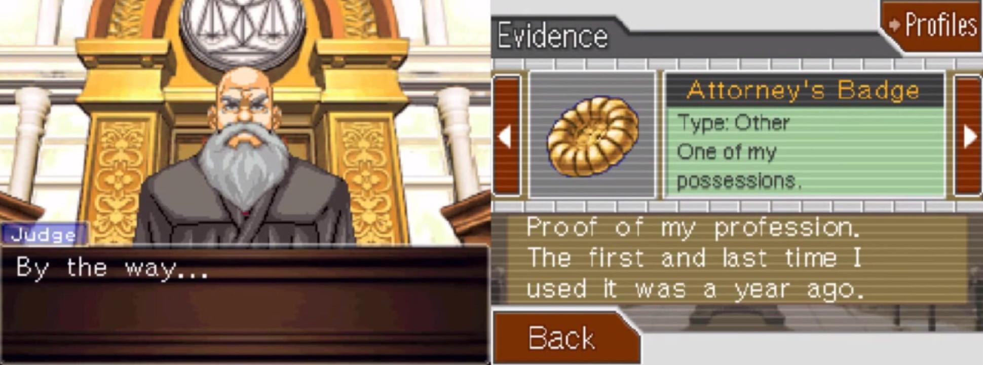 Phoenix Wright: Ace Attorney − Trials and Tribulations (known as Gyakuten Saiban 3 in Japan) is the third game in the Ace Attorney series. Players take on the role of Phoenix Wright, a defense attorney known for taking on seemingly impossible cases. While the game focuses on a few specific cases, the overarching story of the Phoenix Wright franchise spans the length of the series, involving obscure characters from large families and intricate webs of lies, plots, and murder. The nature of the series remains generally lighthearted, something that's reinforced by its playful, anime-inspired visual style, but the nature of the crimes committed can be cold and downright disturbing. While the game's legal acumen is highly dubious, its aim seems to be more about producing comedic or stereotypically dramatic courtroom moments. Ace Attorney 3 makes light use of the DS touch screen, allowing the player to examine crime scenes and inspect evidence and character profiles. The top screen is used more for storytelling purposes, displaying various dialogue and conversations between characters. During these sequences the lower screen becomes a selection menu, displaying a series of questions to ask witnesses and further your investigation in search of evidence to use in defense of your client in each chapter.