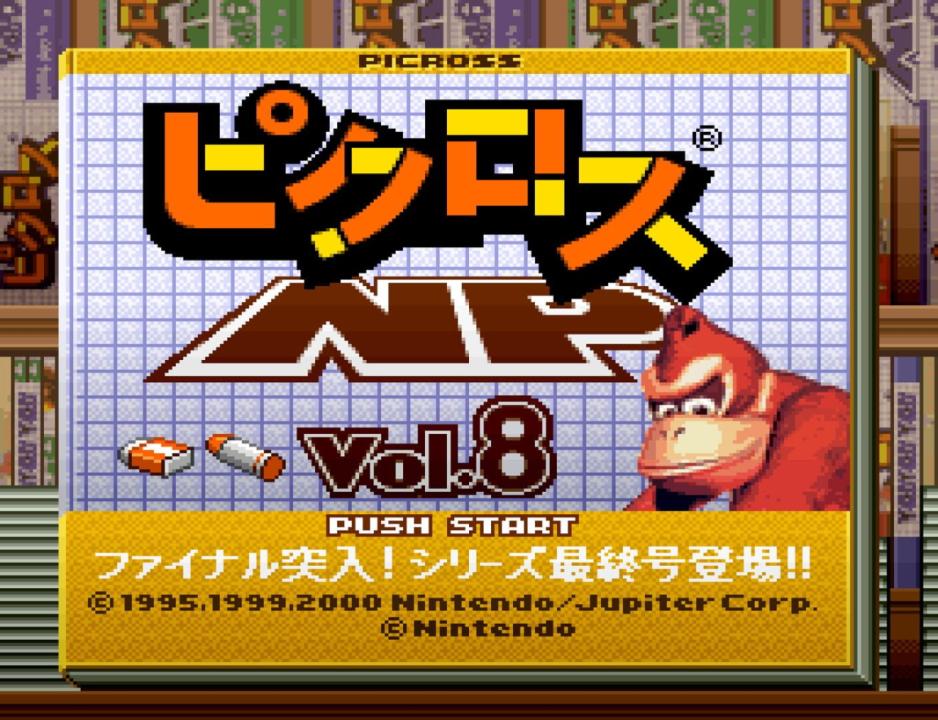 The eighth and final of a series of eight Picross puzzle games distributed over the Nintendo Power cart-writing service. This part includes puzzles featuring characters from Donkey Kong Country.