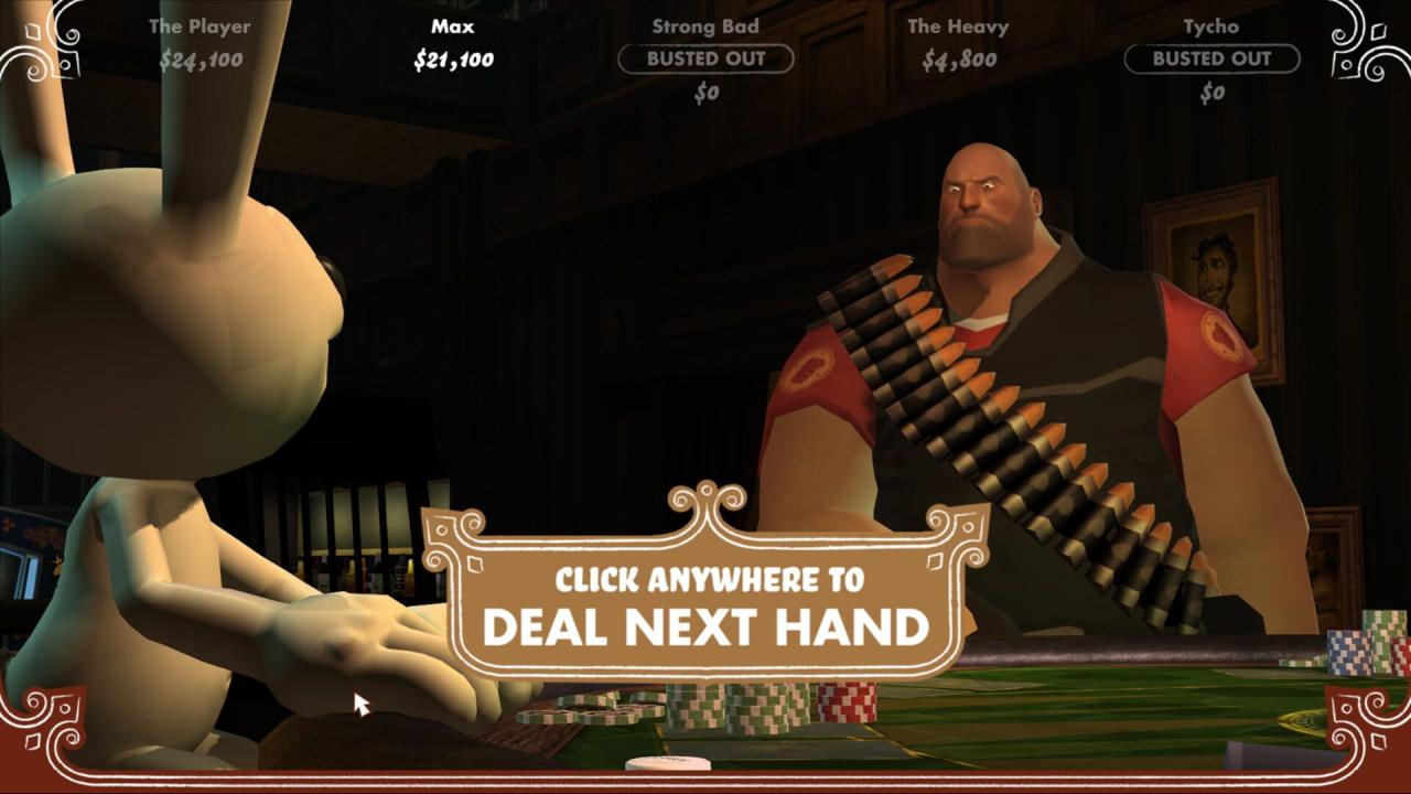 Prepare for a different kind of poker night in a very different kind of club. In Poker Night at the Inventory, you'll deal with Penny Arcade's clever, cunning Tycho, Team Fortress 2's hulking Heavy, Homestar Runner's self-proclaimed "awesome icon" Strong Bad and the hyperkinetic "rabbity-thing" from Sam & Max. These characters come together in ways some never thought possible, in a setting few would have predicted. Unlock new TF2 items by beating The Heavy, Max, Tycho, or Strong Bad at high stakes games of poker.