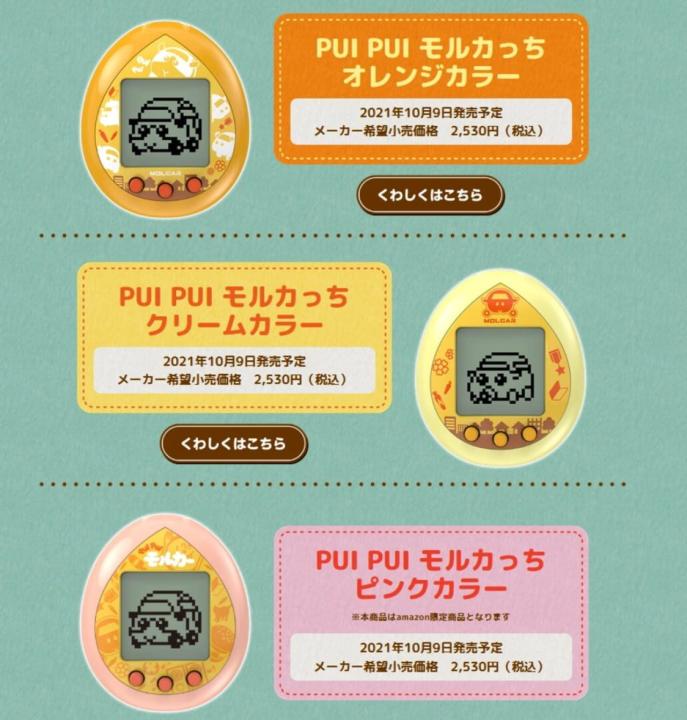 The PUI PUI Molcartchi is a licensed Tamagotchi Nano model based off Pui Pui Molcar, a stop motion series about guinea pigs who are also cars.