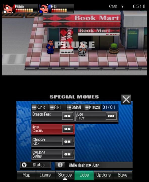 River City: Tokyo Rumble follows the story of a hot-blooded high school student named Kunio and his good friends. When a nefarious gang moves into Tokyo to try to take it over, it's up to this self-proclaimed "fighter for justice" and his buddies to make sure the streets stay safe! Punch, kick, use weapons such as soccer balls, iron knuckles, chains, and even bicycles to knock some sense into those devious gang members. Take on jobs, level up your abilities, and don't forget to stop on occasion for a snack or two at the local food joints. Luckily, smiles are free!