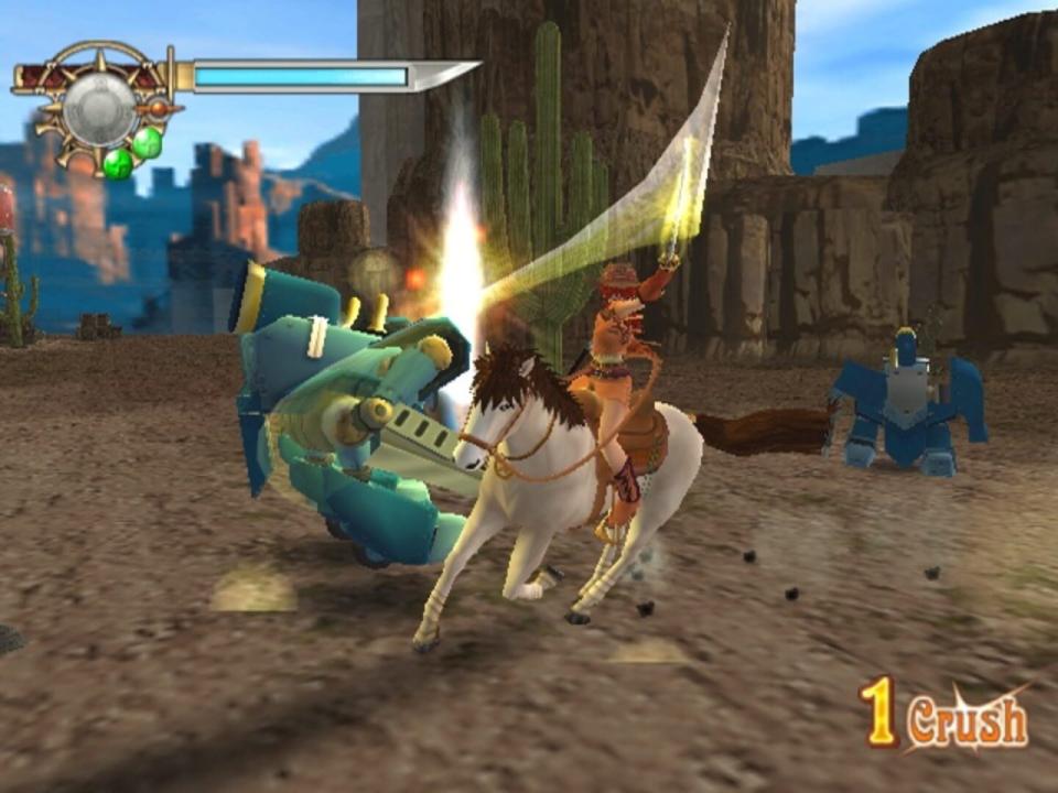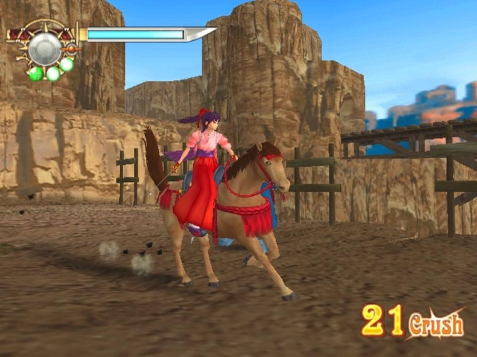 Sakura Taisen V Episode 0: Kouya no Samurai Musume is a prequel to Sakura Wars: So Long, My Love starring one of that game's heroines, Gemini Sunrise. Instead of being an SRPG/visual novel-hybrid like the other games in the series, though, Episode 0 is an action-adventure game. While riding atop her equine companion Larry, Gemini fights evil robots using Japanese sword techniques. The game features experience points and equipment systems that allow the player to upgrade Gemini and Larry's capabilities as they see fit.