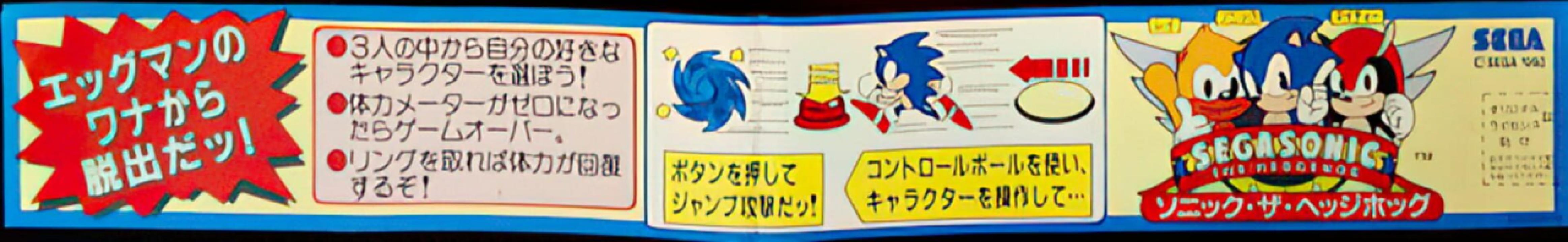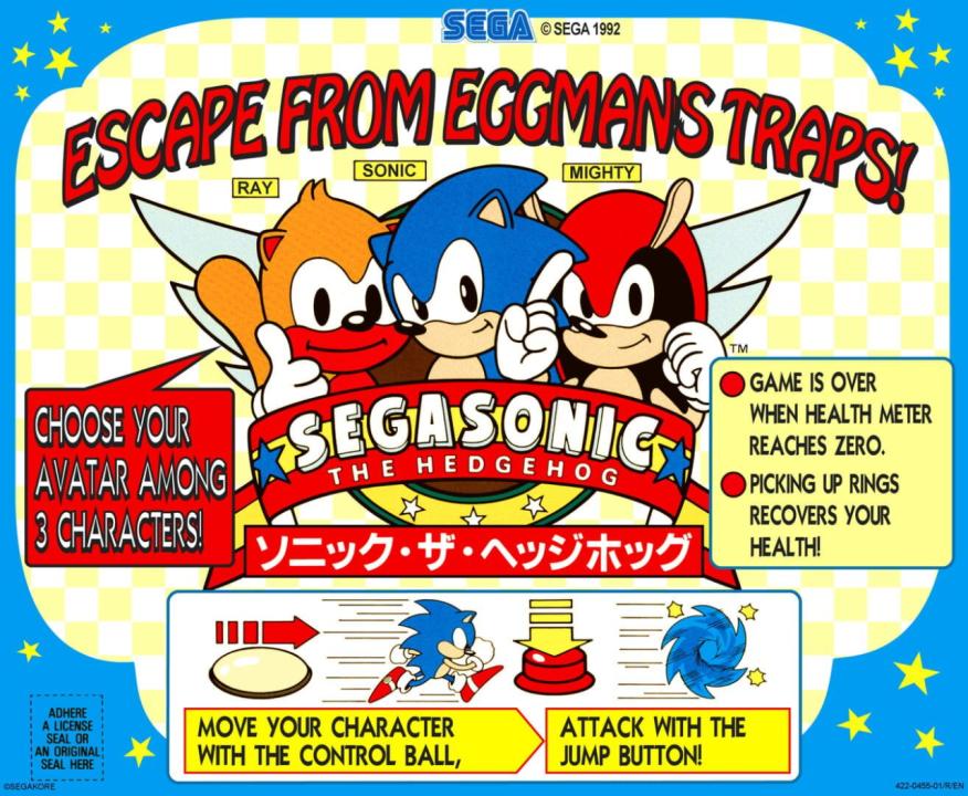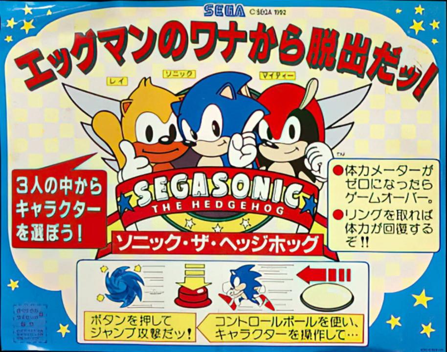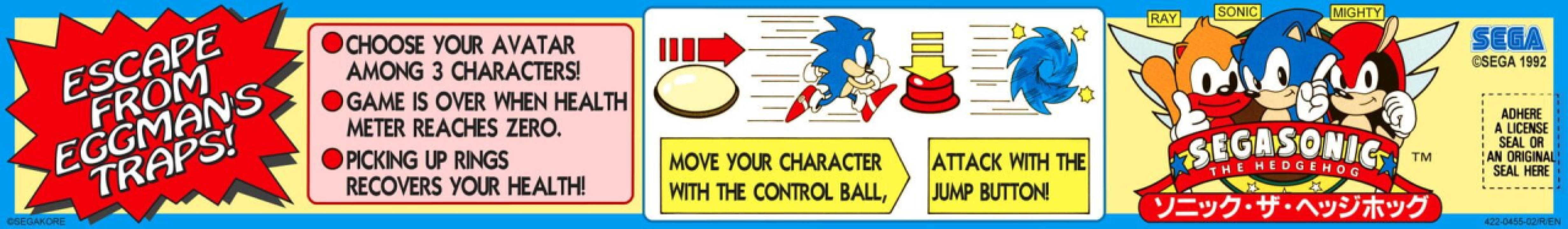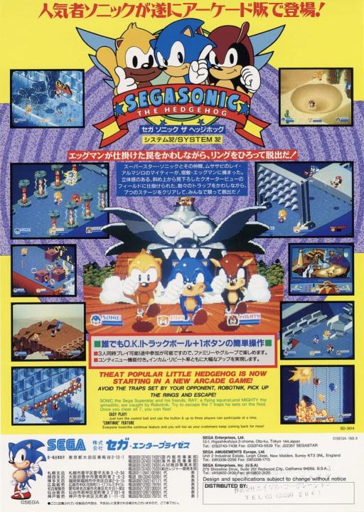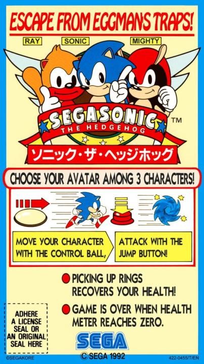 SegaSonic the Hedgehog is an isometric platforming game with three characters who shares identical controls and abilities. The characters are controlled with one action button which lets the player perform a spin jump, and a trackball which is used to move the characters around. Each trackball and corresponding action button are color-coded, meaning the blue ones are for Sonic, red ones are for Mighty and yellow ones are for Ray. The premise of the game is to reach the end of an isometric course without dying. This objective is similar to other video games in the Sonic the Hedgehog series. Yet, it is also different in the sense that instead of a typical platforming game, the game is centered entirely around running as fast as possible on a linear course from a never-ending barrage of threats, including giant boulders, lava flows, rogue gears, falling stalactites, and other traps. When the player is hit by a dangerous obstacle or hazard, they lose health from the Health Gauge, which can be refilled by collecting Rings that found around the arena. Upon completing each level, the game tallies up how many Rings were grabbed. Extra points are also received if over half of the level's Rings were found. The game only has a few enemies and one boss that appears midway through the game. At the end of the final level, the player is given twenty seconds to escape from the self-destructing tower. Failure results in an instant Game Over.
