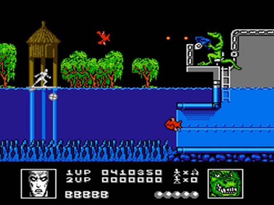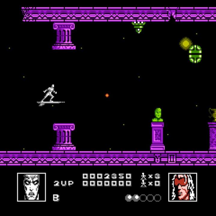 Silver Surfer is a shooter game, with some levels taking place vertically and some horizontally. The Surfer's only ability is to move around on the screen and to shoot directly in front of him. Power-ups that can be picked up include: the letter "F" (Firepower) which will increase the number and power of his projectiles, Smart bombs which destroy everything on the screen, the letter "S" (Speedup) which increases the surfer's movement and Orbs which will also fire the Surfer's weapon. Orbs are special in that two can be obtained (only 1 is shown on horizontal scrolling levels) and they can be positioned to fire forwards, backwards or sideways.