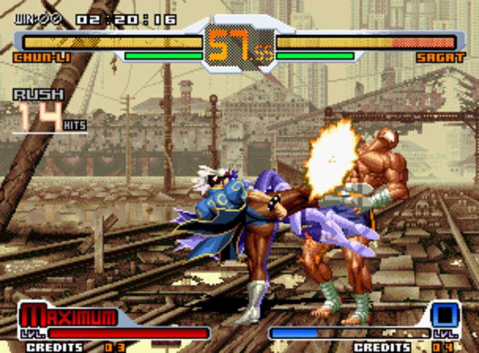 SNK vs. Capcom: SVC Chaos primarily utilizes the command system of The King of Fighters series, incorporating light/strong kicks, punches, cancels and charging attacks. Unlike its predecessor, Capcom vs. SNK 2, this game lacks both air guards and a "groove system", instead focusing on quicker gameplay. Characters are provided with a basic 3-level bar system for executing super-special attacks with basic filling options attributed to strikes and damage. Additionally, the sprites from the various series received new models and some special effects were changed in the command lists (for example, the player cannot increase the damage of the Zujou Sashi used by Choi Bounge by tapping the buttons anymore).