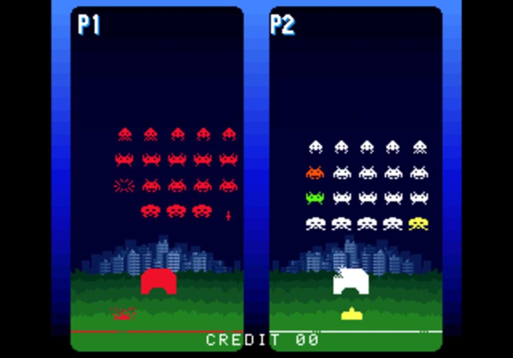 Space Invaders DX consists of four different versions of the original Space Invaders plus two additional game modes, versus mode and parody mode. The versions of the original game all have the same gameplay but have different screen types. They are upright cabinet screen, black and white, black and white with cellophane overlay and colour. The versus mode is played by two players simultaneously on a split screen. It's round based and to win the round the player has to prevent the aliens from landing or clear all aliens. When winning a round the player is awarded with a medal and the first player with three medals wins the game. The versus mode has less aliens and only one barricade and some of the aliens are coloured. Shooting coloured aliens trigger certain actions which can be both positive and negative. This include clearing a whole line of invaders or having the aliens jump closer to the player or his opponent. The parody mode plays just like the original Space Invaders but here each level has a theme based on other Taito games such as Bubble Bobble, The New Zealand Story, Arkanoid and Darius.