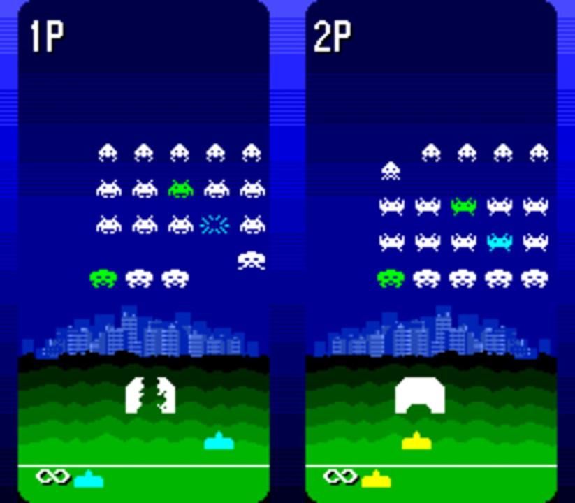 This version of Space Invaders is based on the 1994 arcade game Space Invaders DX but lacks the parody mode of that game. What remains is the classic mode that allows the player to choose the type of arcade cabinet (upright, black & white, etc.) as background to the action as well as the versus mode for two players. The versus mode is split-screen, each player trying to survive and eliminate more invaders than the opponent. The PC Engine (TurboGrafx) CD version offers an additional "cosmic versus" mode, where the background is composed of anime-style pictures of girls. They also appear in the "omake mode", which is a single-player variant with the same backgrounds.