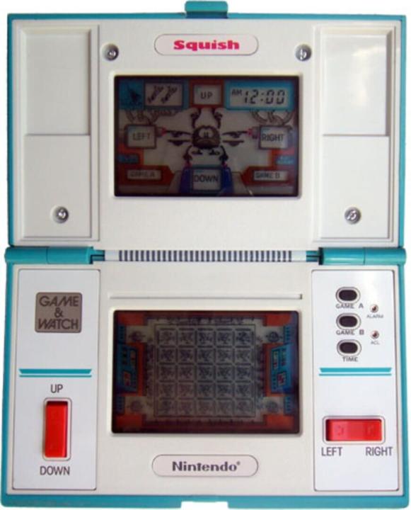 Squish is a Multi Screen Game & Watch video game released in 1986 by Nintendo. The game was never released in Japan. A Pocketsize version of the game was also released. The unit's model number was MG-61. In the game, you have to avoid the platforms that are coming towards the player character, Ziggy the Mazeman. The game's name comes from the fact that you'll be "squished" if a platform hits you. The top screen contained game information, while all of the action took place on the bottom screen. This and Zelda were the only two games to have a format like this when it came to multi-screen games.