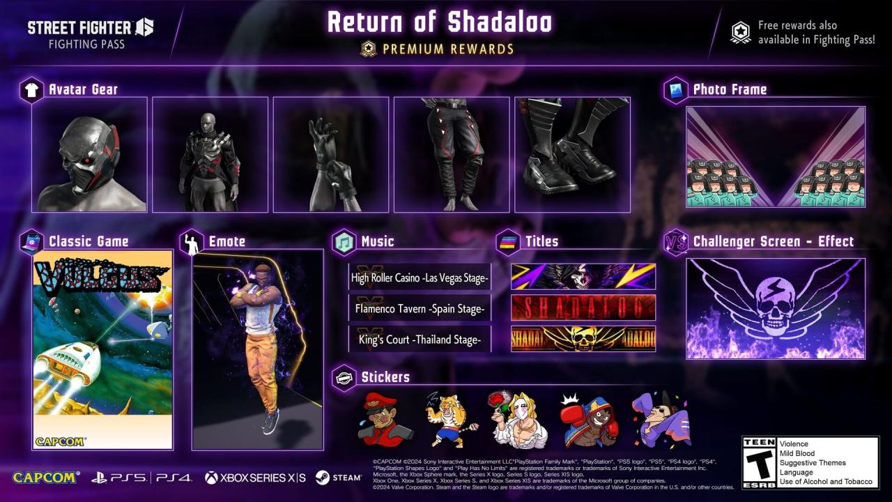 Get the most out of Street Fighter 6 with the Fighting Pass! This month's theme: Return of Shadaloo Free rewards are available now for all players, as well as access to premium rewards for 250 Fighter Coins. Also, starting this month, special effects for the New Challenger screen are included in the rewards! Rewards include avatar gear, emotes, music, stickers and wallpaper, and the theme will change every month. Don't miss out since rewards are available for a limited time! Note: The Fighting Pass can be purchased from the in-game shop using Fighter Coins. Avatar gear is cosmetic only and does not affect character fighting attributes.