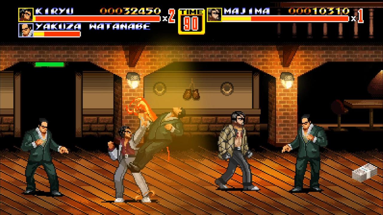 Streets of Kamurocho is a retro-style beat 'em up game developed by Empty Clip Studios and published by SEGA. It was released as part of SEGA’s 60th anniversary celebration. The game combines the gameplay mechanics of Streets of Rage 2 with characters and themes from the Yakuza series, featuring pixel art versions of Kazuma Kiryu and Goro Majima fighting through the streets of Kamurocho.