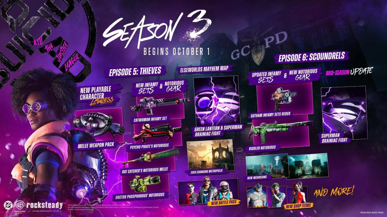 Suicide Squad: Kill the Justice League – Season of Lawless launched on October 1, 2024, adding Zoe Lawton (Lawless) as a playable character, a Gotham-themed Elseworld location, new missions, Infamy gear sets, and a Battle Pass. The update is available for all platforms as a free expansion.