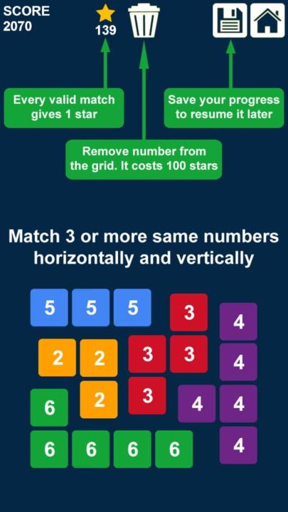 Swap n Merge is a brand new puzzle game. It is totally free merge numbers game without in-app purchases. Swap n Merge is a relaxing and brain training match 3 number game. How to play: - Swap 2 Numbers in any direction. - match 3 or more same numbers horizontally and vertically. Rules: - No automatic swap-back even there is no match. - Every match gives 1 star. - Every swap without match costs 5 points. The cost is incremented by 5 points every level. - It costs 100 stars to remove a number from the grid using the Remove button. - It is your responsibility to save your progress to resume it later by hitting the Save button. Every new level: minimum and maximum generated numbers are increased by 1. So try to match all minimum numbers before the next level because they will not be generated again. Play, enjoy and have fun.