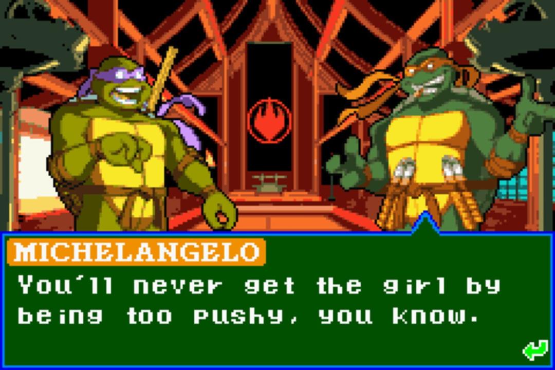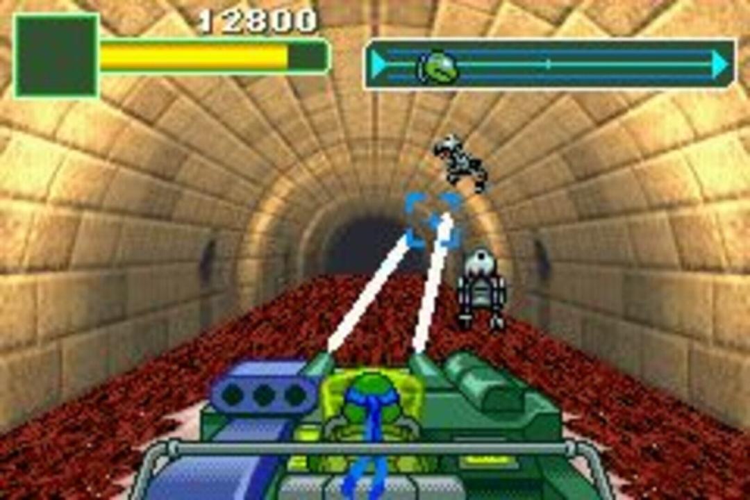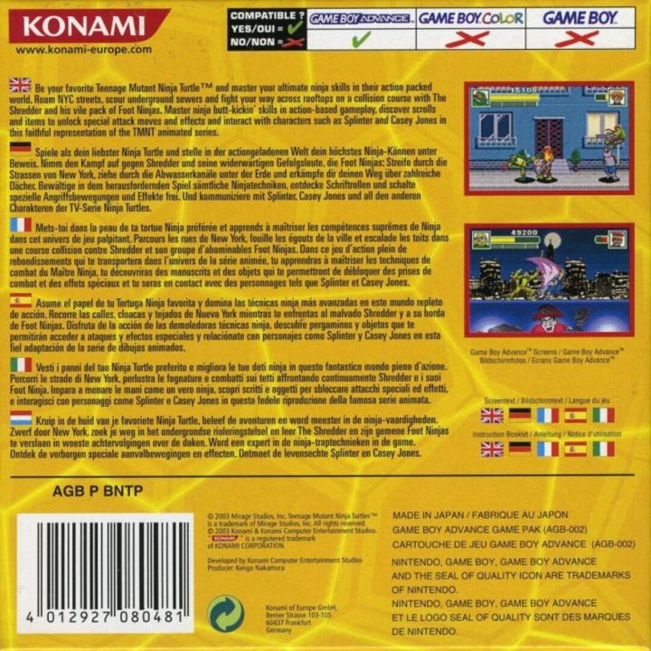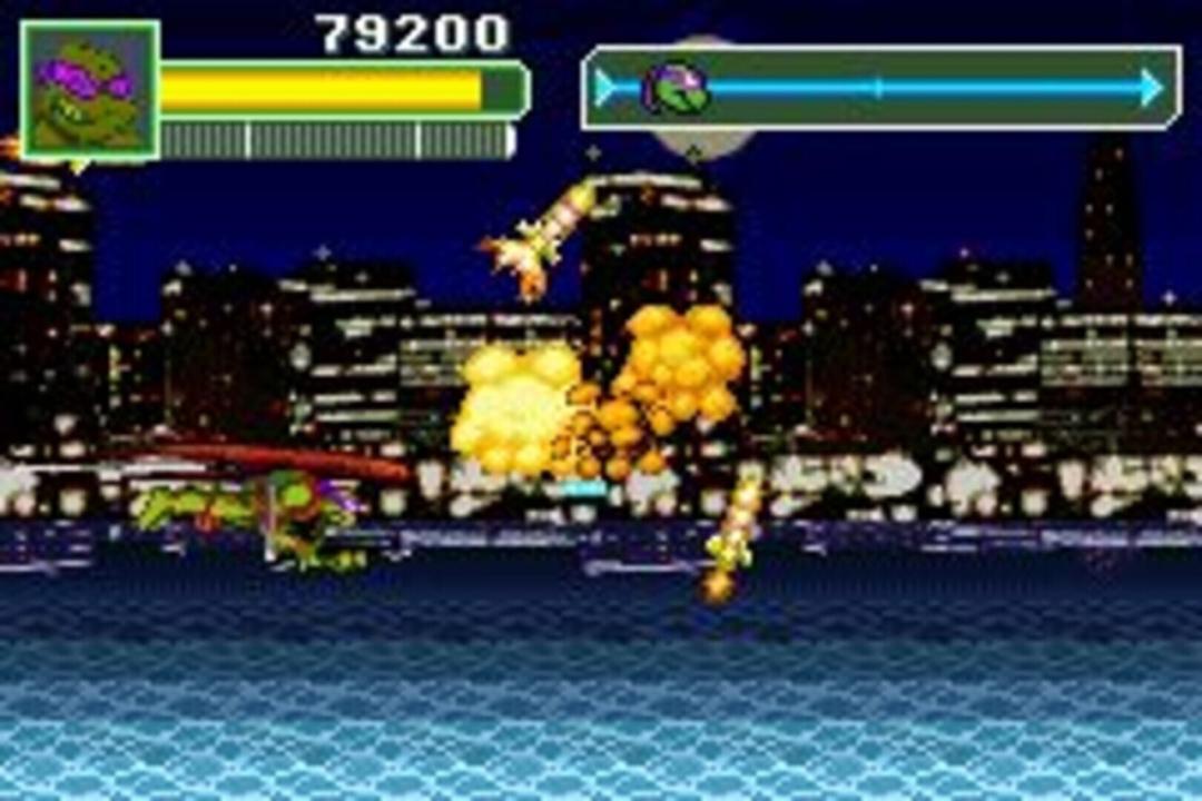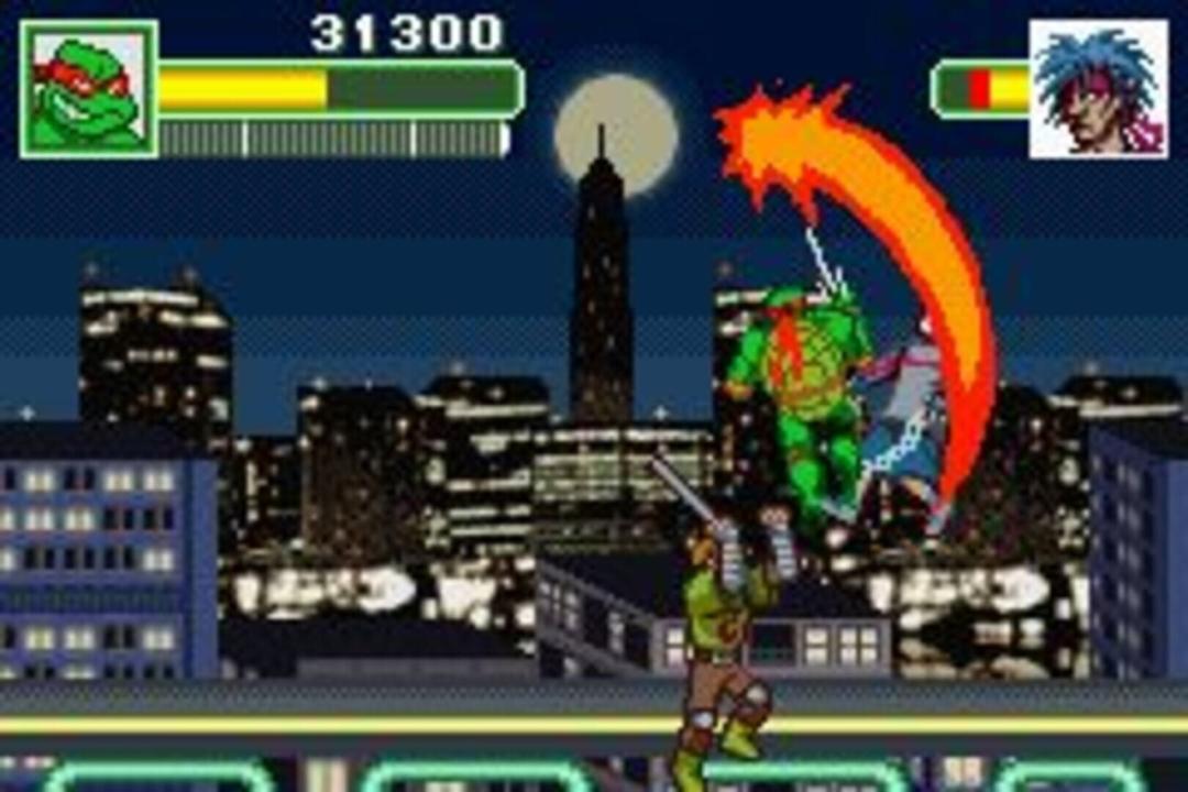 Teenage Mutant Ninja Turtles is a 2003 Game Boy Advance video game, based on the 2003 TV series. In this game each Turtle has his own unique set of levels to complete. In addition to the traditional side-scrolling levels, there are third-person view races, a shell-glider level for Donatello and a bike race between Raphael and Casey Jones. The game was also issued in a double pack with it's sequel TMNT 2: Battle Nexus.