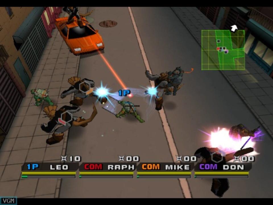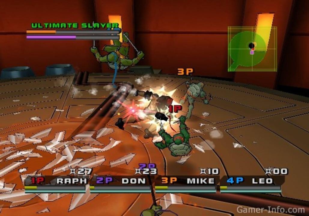 In Episode 1, the turtles begin saving an old person in New York City from sadistic Triceratons. After destroying three carriers deploying the Triceraton army, the turtles go underground to reach the Central Park to rescue their friends Casey and April. While in the park, Leo Raph Mikey and Don defend against the Triceratons and Professor Honeycutt pegged as the Fugitoid saved from TMNT 2 Battle Nexus assists the turtles in finding where Casey Jones and April O'Neil are held captive. Breaking into the Triceraton's base, Zaranmon, commander in chief of the Triceraton's mobilizes a robot in effort of stopping the Turtles and Traximus. Zaranmon's attempt is a failure and Traximus destroys a chair to make change in their clan. In Episode 2, the turtles discover new technology coming from Baxter Stockman as Mousers infiltrate the sewer causing intense pain to the ears of Master Splinter. While protecting their sensei, the ninja turtles are fending off the Mousers while staying close to him. However, Master Splinter ends up captured and the turtles use hovercraft to chase down a moving van. They are soon blocked by a tall and a small enemy duo for an ambush. Once passed them, the turtles resume in their rescue mission for Master Splinter eventually fighting with Bishop then having to use throwing stars to break a lock to free him. In Episode 3, the Turtles encounter every member of the Foot Clan through the missions. Hun, Karai, and Oroku Saki, the human identity of Shredder all fall down to the turtles. Towards the final battle with Saki, he is upgraded as Mega Shredder. The ninja turtles defeat him and then are summoned upon the Utrom council for a tribunal. Scherel, the Utrom controlling Shredder's body is charged for devious crimes and is exiled to an icy planet while Karai and the others are turned into the authorities as the main game ends. In the Nightmare chapter, each of the turtles have a dream and encounter various bosses. Clearing most of the missions in this chapter leads to the game's final boss, Ultimate Drako. To use the gembu scrolls to activate the Ultimate Turtle forms, the player must collect scrolls and other content in Free Battle mode.