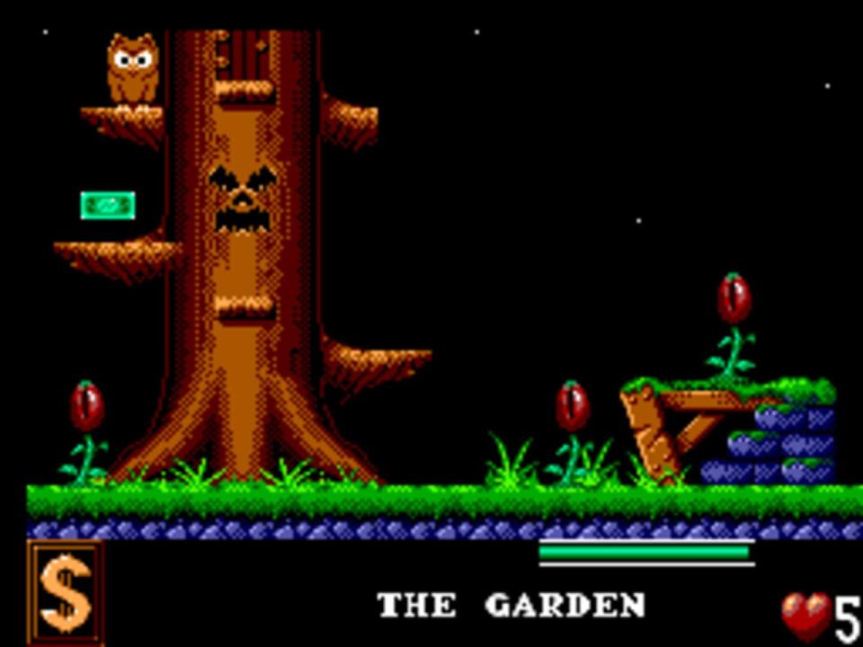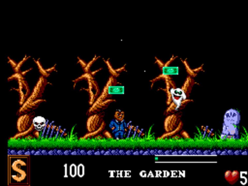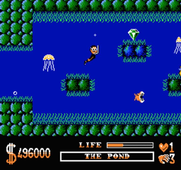 The Addams Family is a side-scrolling platformer based on the movie of the same name. The player takes the role of Gomez who searches for his missing family members. To find them he has to explore six different parts of the mansion, e.g. the woods, which are basic platform levels: the player moves from left to right while jumping a lot and avoiding enemies. Some of them can be dispatched of by a jump on their heads. The main difference to the other versions of this game is a unique level design. There is also a life meter which allows to get hit more often before dying.
