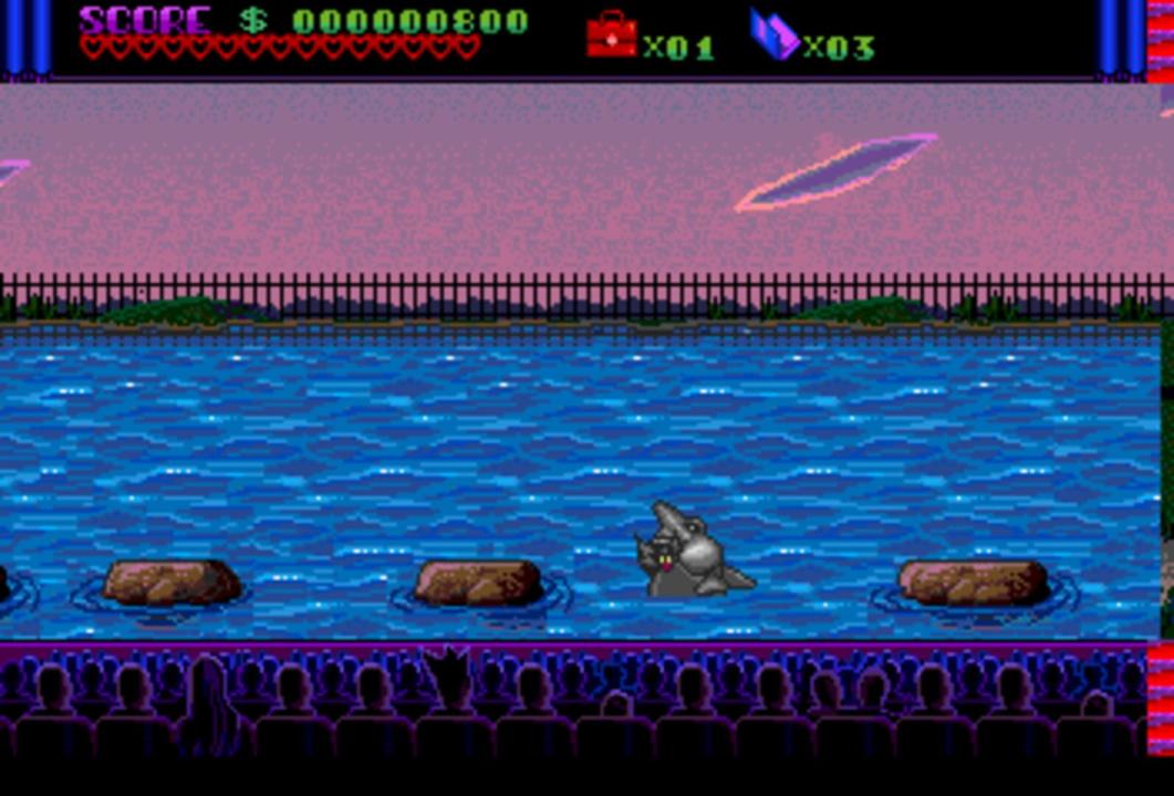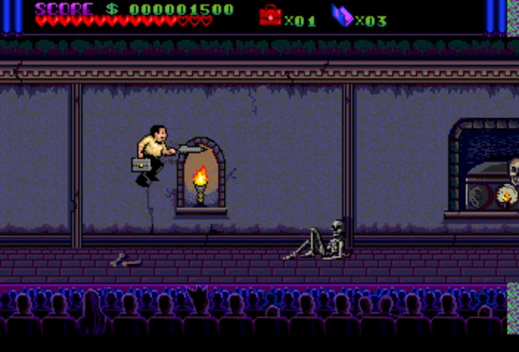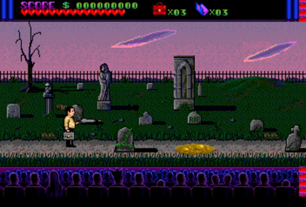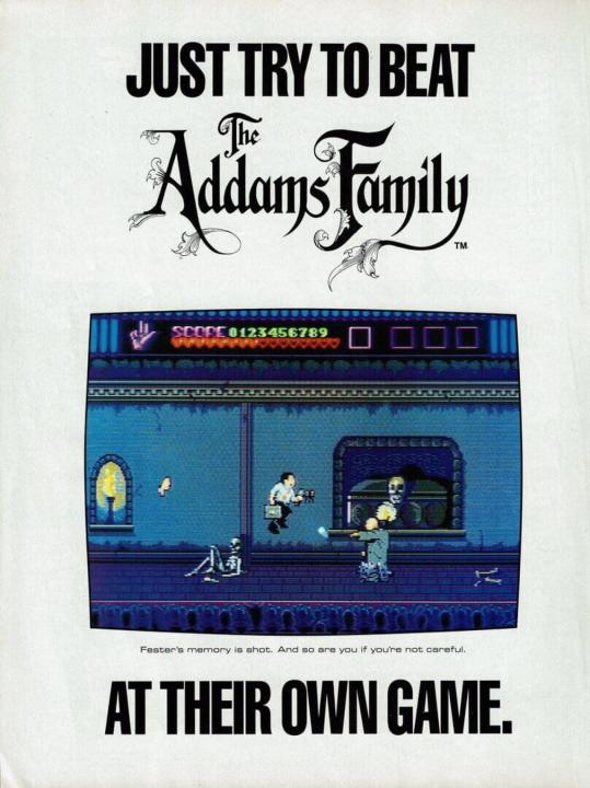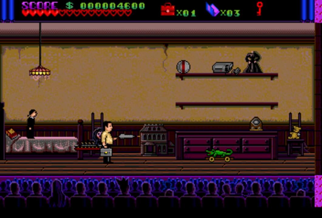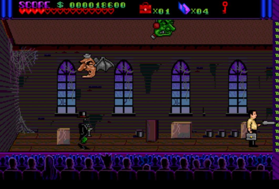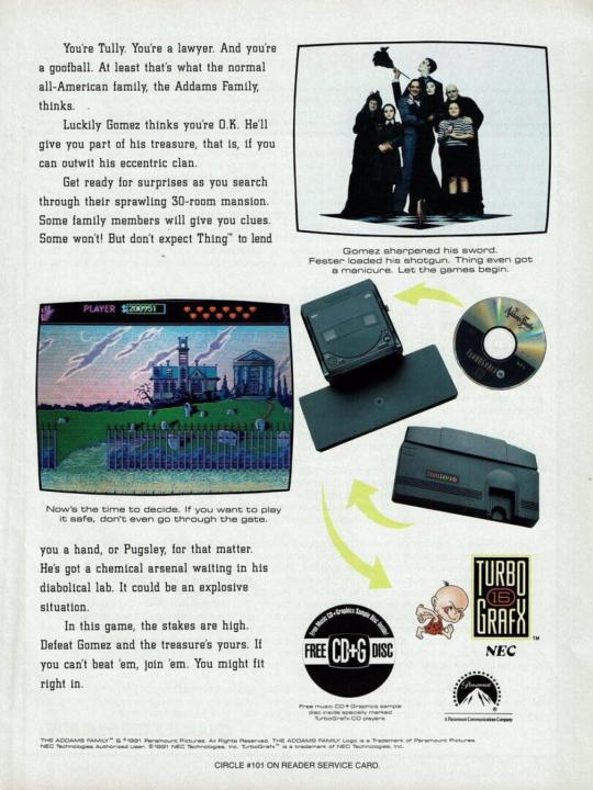 Based on the Addams Family movie, the TurboGrafx-16 CD version is quite different from the other Addams Family variants. The player is cast in the role of Tully Alford, the crooked lawyer of the Addams family. He finds out that somewhere in the family mansion, a great treasure is stored in a vault. He decides to venture into the mansion and retrieve the treasure. Naturally, this is going to be anything but easy, as the insane Addams family members and a legion of ghosts and monsters are there to make sure the lawyer fails... Like most other Addams Family incarnations, this is a side-scrolling action game. Tully Alford's only weapon is an umbrella that fires energy shots at enemies. Tully can also jump and duck to avoid enemy blows. The game world consists of a "hub" area, the hall of Addams Family mansion, and many rooms, most of which are locked in the beginning of the game. The gameplay consists mainly of exploring the accessible rooms and collecting keys that are needed to open other doors in the process. Some of the rooms contain treasure and power-ups, while others are infested by monsters or require the player to defeat a boss enemy in order to advance.