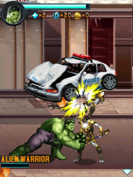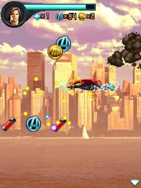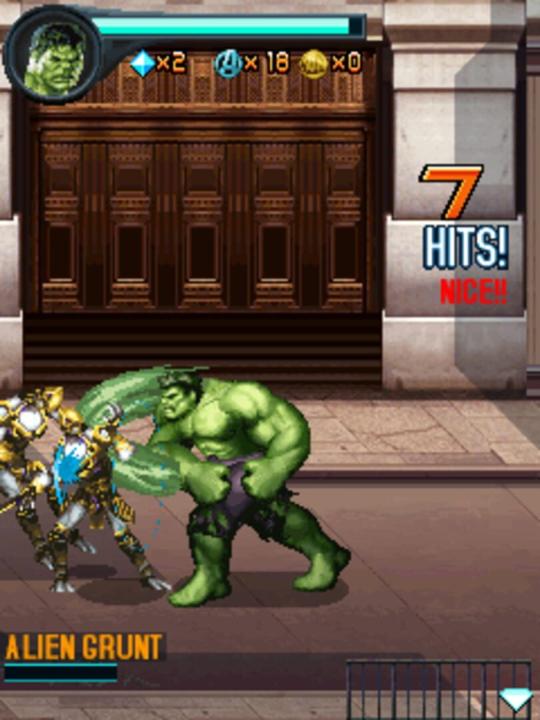 The Avengers: The Mobile Game is an action game based on the 2012 movie of the same name. Loki has come to earth to conquer it with the help of an alien race known as the Chitauri. In the game the player takes control of Iron Man, Captain America, Thor and the Hulk. The game is a 2D side scrolling beat 'em up where the player each level controls a different hero. Along way Avenger badges can be collected, each badges 100 earns the player an extra live. Health can also be replenished. The levels of Iron Man, Captain America and the Hulk take place on the ground while Thor fly’s through the sky in his levels. Some sections involve climbing and the Hulk can pick up objects that can be hurled at enemies.