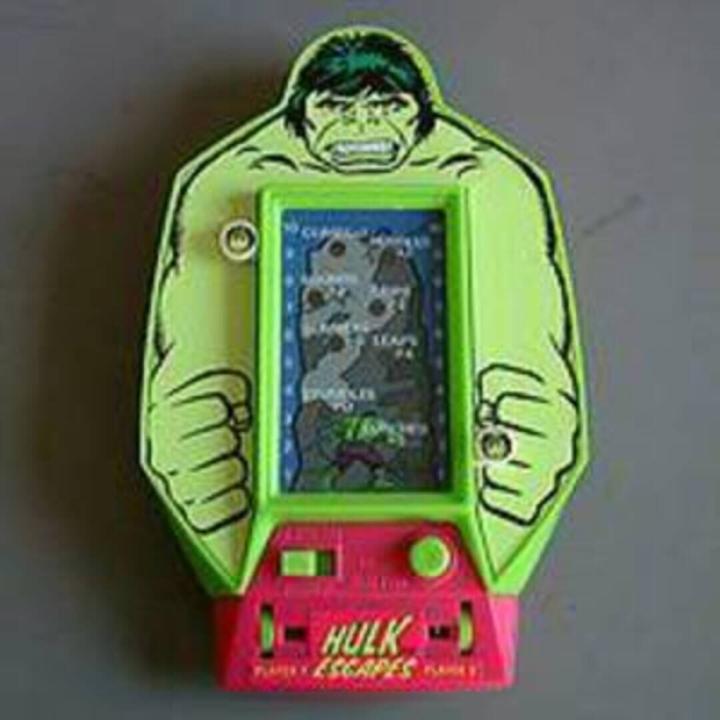 The Incredible Hulk Escapes is a simple handheld game mostly based on random luck. The player presses a button to which different lights will light up leading to different scores. The scores need to be counted up manually and added to the score wheel while the Hulk climbs higher and higher. The game can be played with two players.
