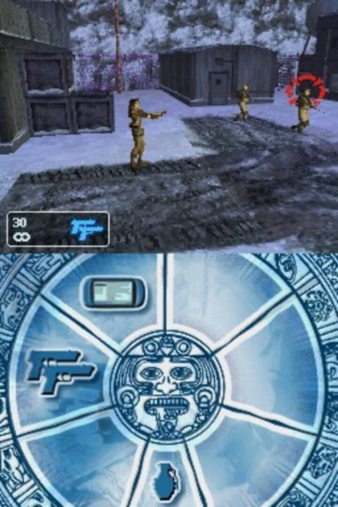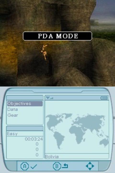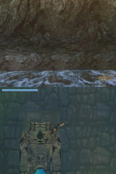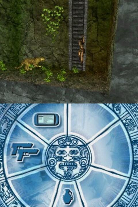 The Nintendo DS version of Tomb Raider: Legend differs significantly from its console counterparts. While it retains the original plot and cutscenes, the platforming and environmental puzzles have been adapted into a side-scrolling format with some 3D elements. The game also includes occasional motorcycle segments. Typically, the upper screen displays the main action, while the lower screen manages inventory, which is controlled using the stylus. During combat, the lower screen shifts to a first-person view, requiring players to tap enemies to defeat them. As in other versions, gameplay centers on retrieving artifacts in exotic locations; on the DS, players must blow into the microphone to dust them off. Although Lara moves primarily in two dimensions, the graphics are rendered in 3D, and the environments are often presented from varied angles, diverging from the traditional side-on perspective common in the genre.