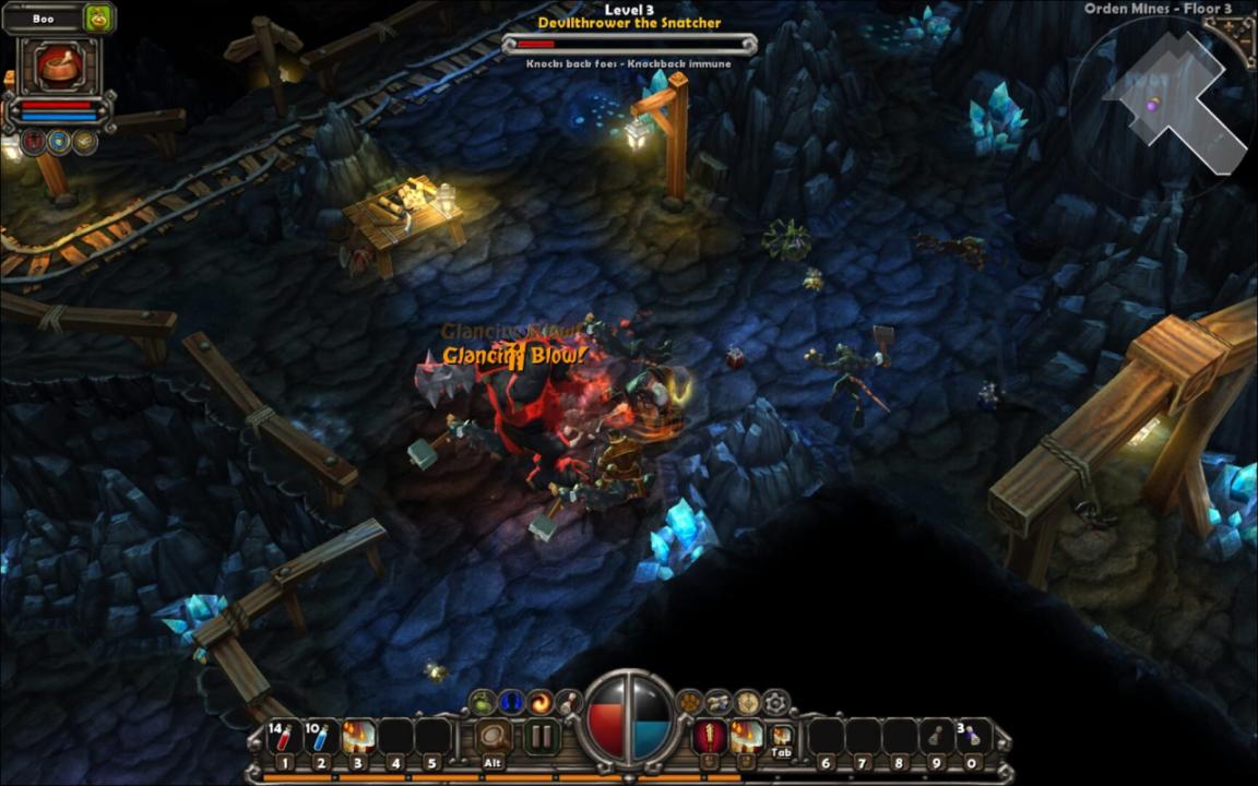 In this ARPG you control a hero who explores a series of randomized dungeons, fightinghordes of enemies and collecting equipment, gold, and loot while doing so. The game also features a town , to which the hero can return to sell and buy gear and items and pick up quests. As you progress into the dungeon, you get to battle unique bosses that advance the main storyline by completing quests revolving around them. Optionally, the player may take on side quests, random quests or visit branching dungeon areas to further develop their character.