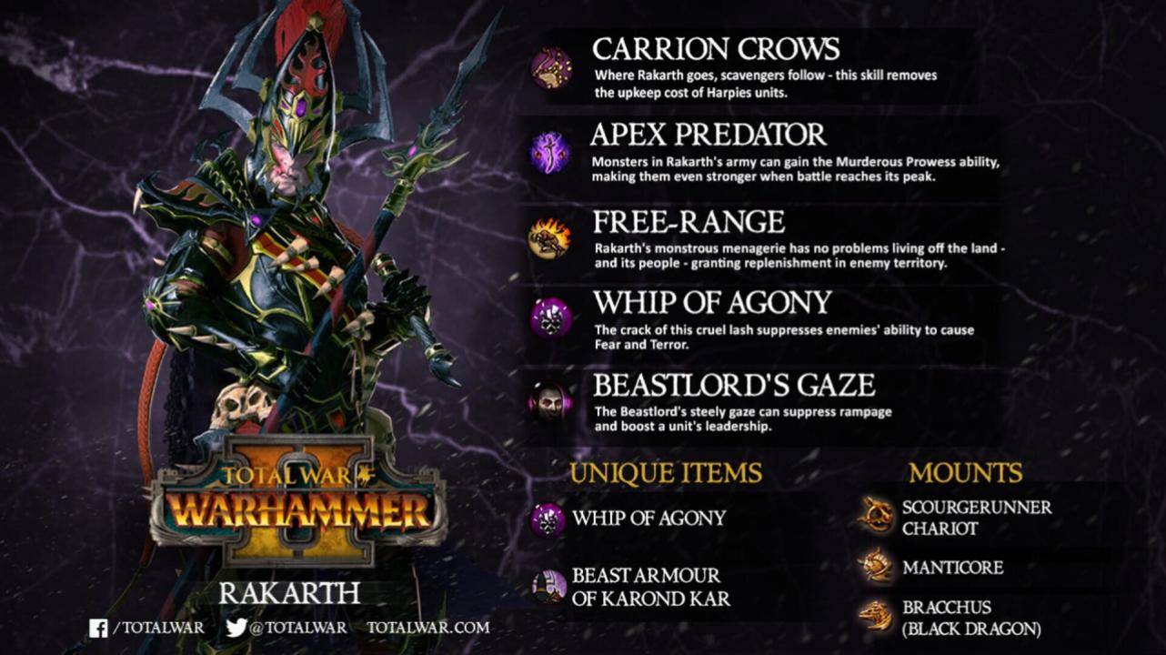 Since taming the infamous black dragon Bracchus as a youth, Rakarth has long held a reputation as the most cruelly talented of Naggaroth’s Beastmasters. It is a claim none dispute, as he soars high over the battlefield on the mighty beast before diving into the fray in a murderous blur of talons and teeth. Voiced by actor Iwan Rheon, Rakarth begins play on the Isle of Albion and leads the Thousand Maws faction. As he claims victory in battle and captures key settlements, new monsters of all kinds are added to his Beast Pens where they may be recruited into his armies.