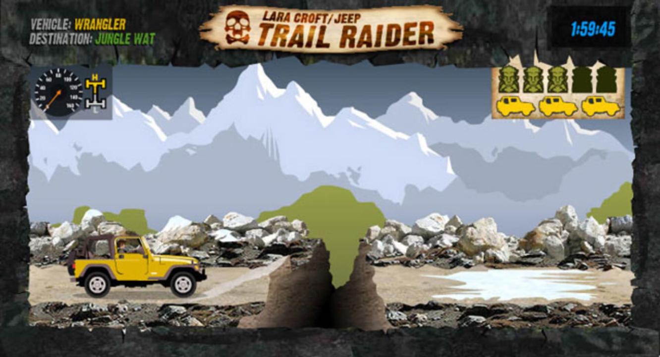 Trail Raider is a promotional flash game for Tomb Raider and Chrysler/Jeep, coinciding with the release of Tomb Raider: Legend. The game utilizes an easy to play adventure game that demonstrate new Jeep four wheel drive technologies in the new '06 models as well as leveraging the Tomb Raider and Lara Croft brand. The game has three levels. On level 1 the player drives Jeep Wrangler, Level 2 has Jeep Commander, and on level 3 the game lets the player choose the Jeep vehicles. The goal of the game is to finish the levels as fast as possible.