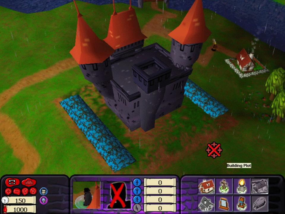 Labeled as a "management game" by its publisher, Monster Ville could better be described as an action/basic RTS game with a humorous tone, starring the Universal Studios Monsters: Dracula, the Monster of Frankenstein, the Bride of Frankenstein, the Werewolf, etc. The objective is to control a medieval town of humble peasants by hypnotizing the citizens. Two or more monsters compete for the domination of the town and have a limited time to use their magic powers to convince a majority of peasants to rally to their cause. Each monster has its own special powers (e.g. Dracula can fly), strengths and weaknesses. You can use a series of traps to stop your enemy's advance (e.g. place a mirror somewhere to stop Quasimodo, since he can't stand his own reflection), or build new dwellings for your supporters. On certain maps, there's a "neutral" monster that you can hypnotize too and use as a secondary character to gain support amongst the citizens twice as fast.