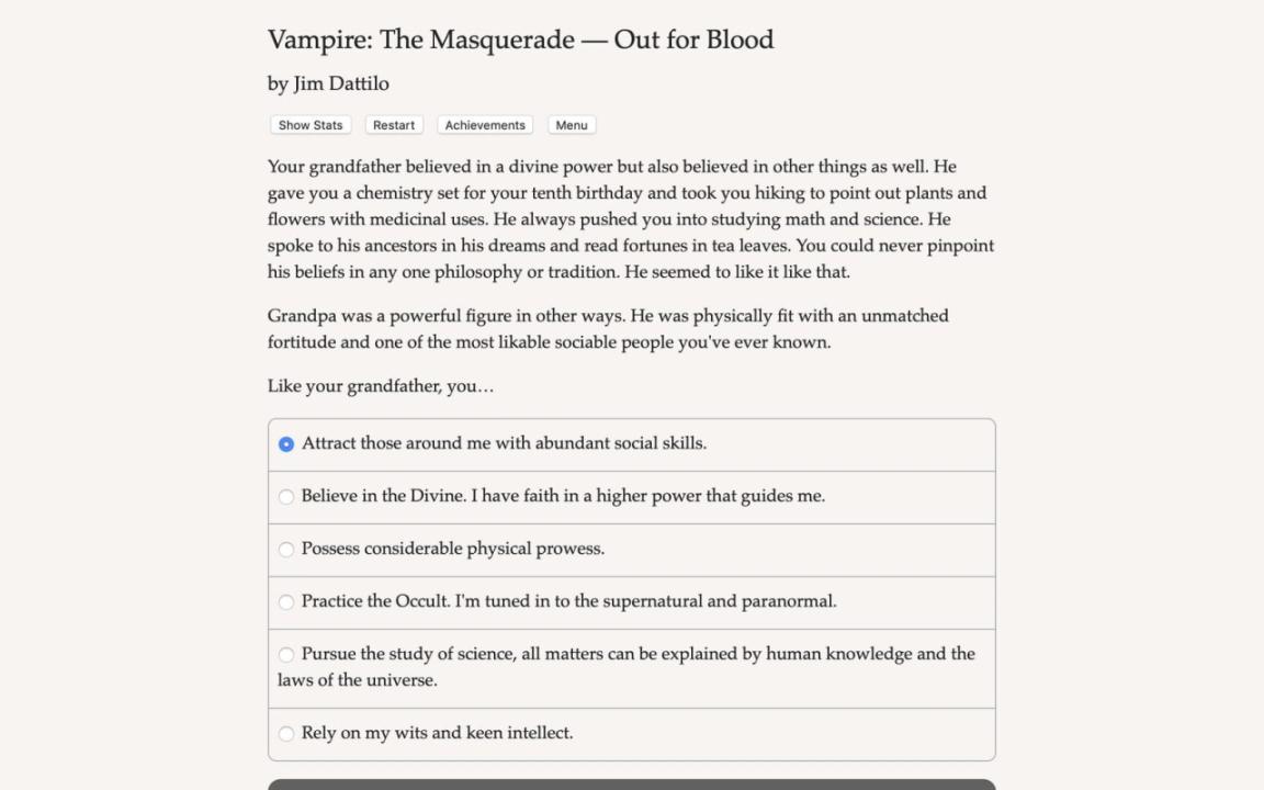 Vampire: The Masquerade — Out for Blood is an interactive horror novel by Jim Dattilo, based on Vampire: The Masquerade and set in the World of Darkness shared story universe. Your choices control the story. It's entirely text-based, without graphics or sound effects, and fueled by the vast, unstoppable power of your imagination. You’ve barely settled into your new home of Jericho Heights on the outskirts of Chicago, before discovering that vampires live in town. You’re struggling to start a new life, meet new people, and maybe even find love. But when your neighbors start disappearing, you’re forced to take action. Take on the role of a vampire hunter to save your town from the influence of Chastain, a vampire more than a century old. When a group of young thin-blood vampires start a war with Chastain, will you choose sides, or hunt them all? Gather your forces and sharpen your stake to take back the night! - Play as male, female, or nonbinary; gay, straight, or bi. - Choose from classic VtM attributes and skills to build out your character. - Employ science and technology, True Faith, or the occult. - Meet an ensemble cast of dynamic characters each with their own skills. - Romance other characters, either human or vampire. - Hunt vampires, study their ways, or try to be Embraced.