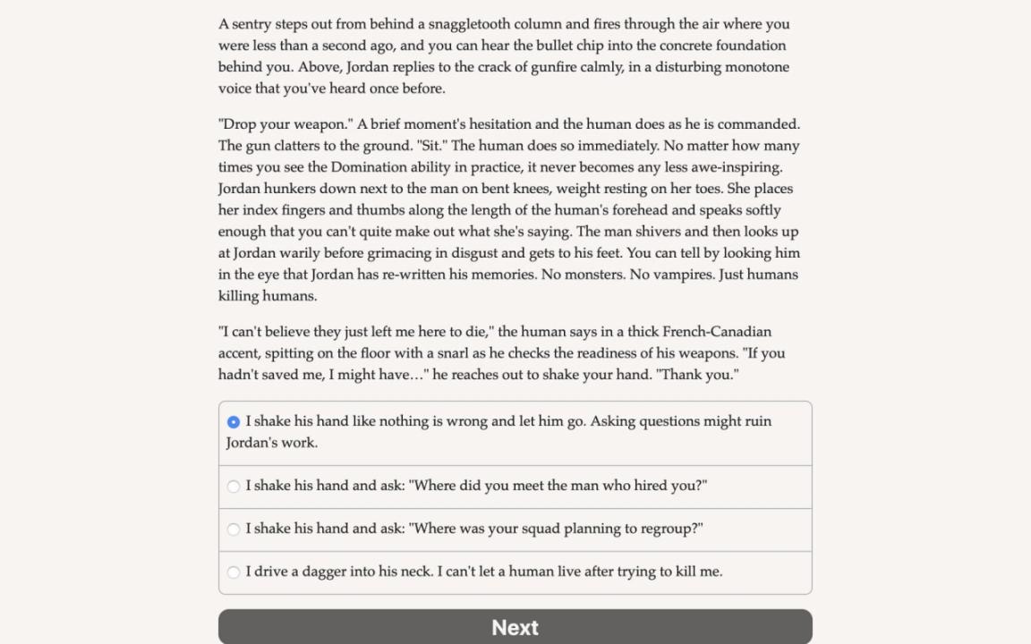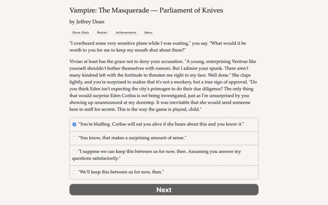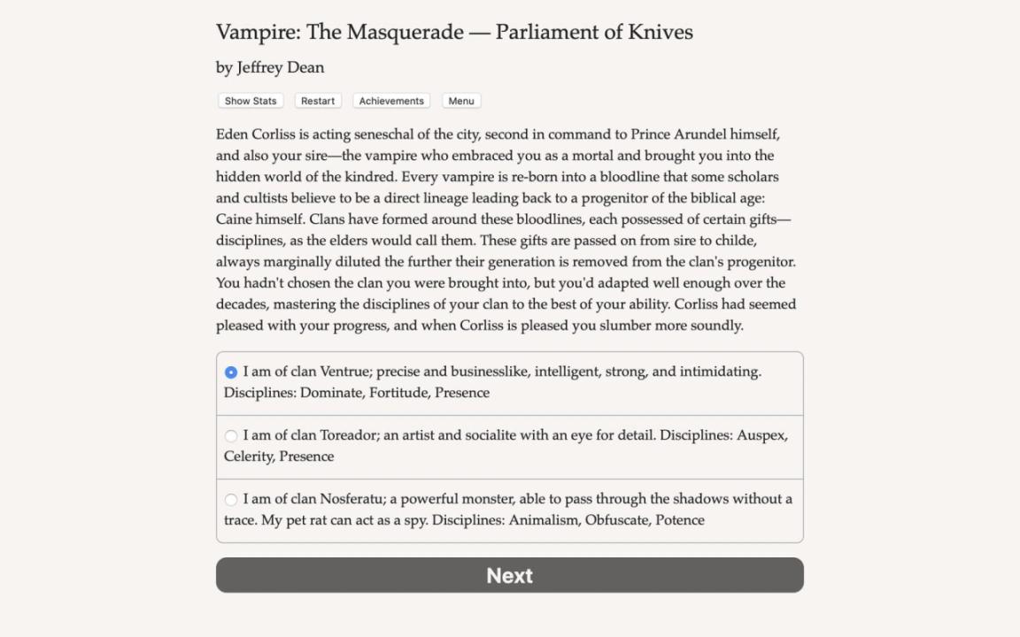 Vampire: The Masquerade — Parliament of Knives is an interactive horror novel by Jeffrey Dean, based on Vampire: The Masquerade and set in the World of Darkness shared story universe. Your choices control the story. It's entirely text-based—without graphics or sound effects—and fueled by the vast, unstoppable power of your imagination. The undead Prince of Canada's capital city has disappeared, and his second-in-command, Eden Corliss, wants you to find out why. You’ve been loyal to Corliss since she Embraced you and made you a vampire, but this could be your chance to take her place. Will you defend your sire from the accusations flying, or join forces with her rivals to bring her down? Ottawa’s court of immortals is tight-knit and merciless, with tensions between clans that go back centuries. The Prince has been missing for four days, and old alliances are starting to crumble. How will you leverage the political chaos to your advantage? The authorities are already on high alert against a new group of Anarchs in the city, who have been breaching the Masquerade by revealing their true nature. You’ll have to gather evidence to demonstrate which suspects deserve punishment, and you can’t afford to guess wrong. One careless word could get you stabbed in the back—staked through the heart, and left to burn in the sun. Who will you save when the knives are out? - Choose from three clans, each with different gifts. - Flaunt your coercive dominance as a Ventrue, your dark stealth as a Nosferatu, or your heightened senses as a Toreador. - Master the social scene and ensnare the weak in your thrall. - Command your own manservant and ghoul. - Attack the Anarchs in the city, or help them take over. - Uncover the lies at the heart of Ottawa’s immortal court. - Romance a sheriff or a seer. - Feast on the blood dolls of your charismatic ally. - Play as male, female, or nonbinary; gay, straight, or bi.