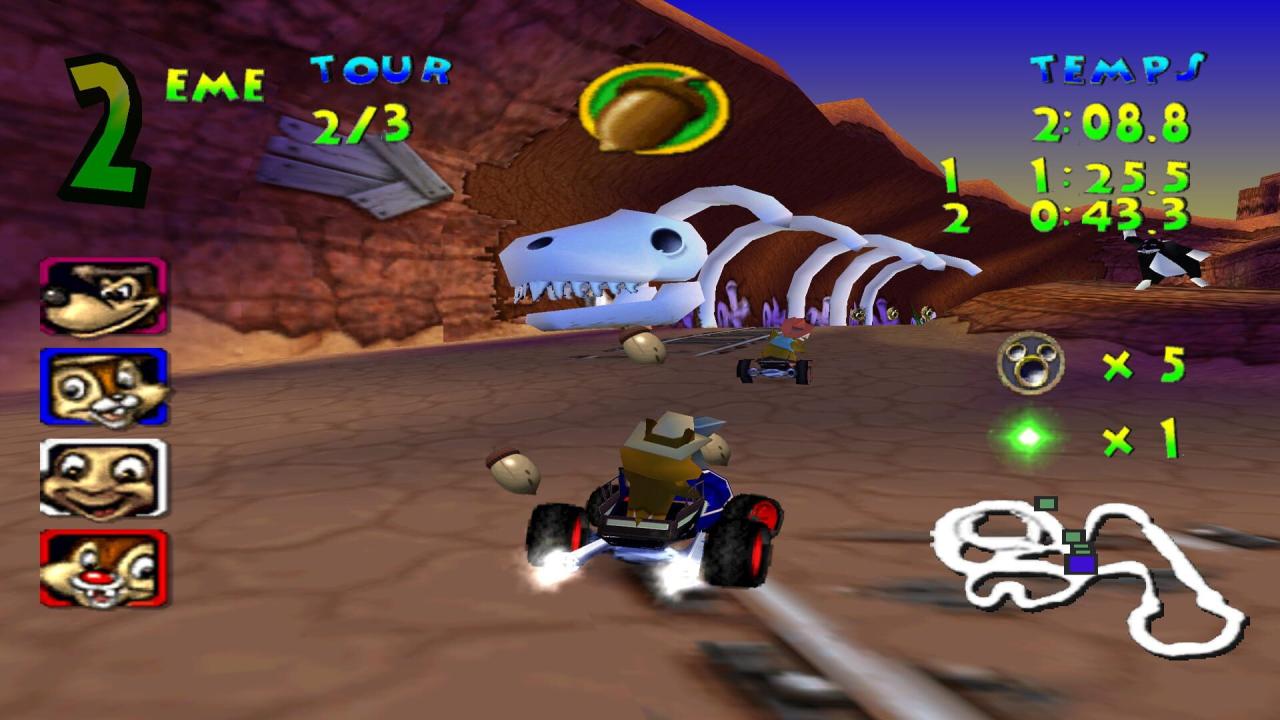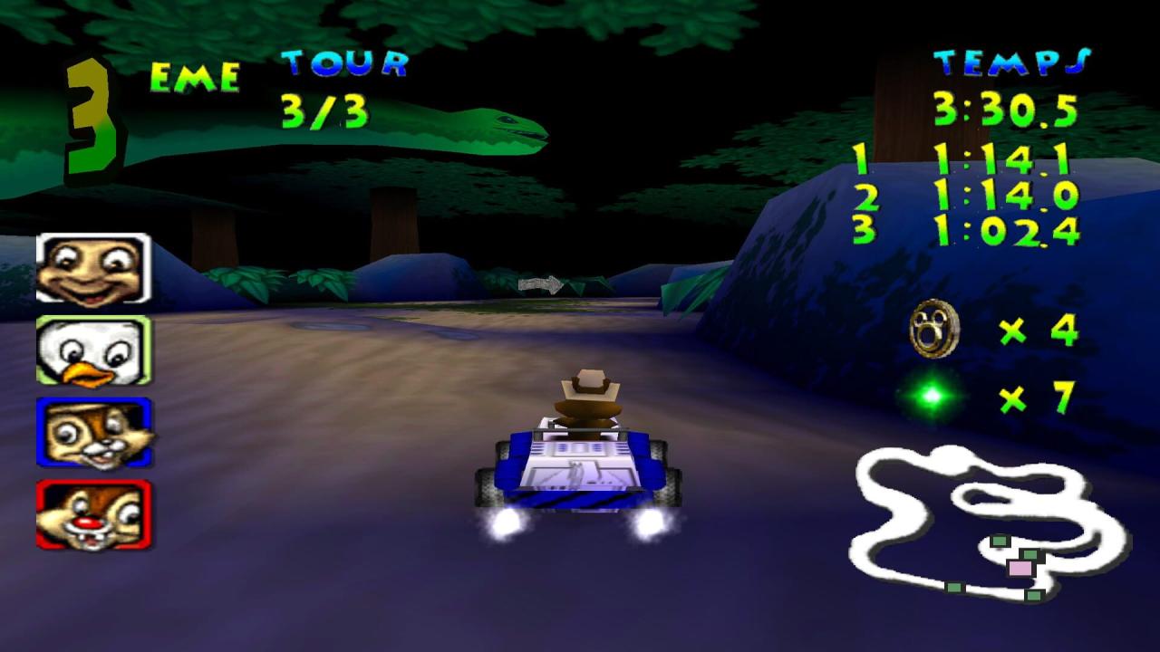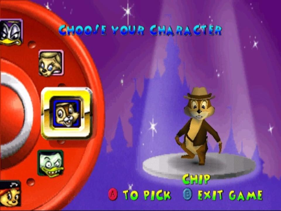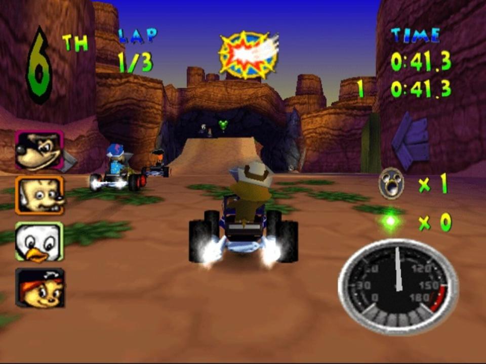 Walt Disney World Quest Magical Racing Tour boasts more playable characters than any kart racer before it (a total of 13 are offered), and each of the game's tracks allows you to maneuver a different vehicle. Instead of being confined to just a go-kart, you'll get a bobsled, or a rocket ship, and several others. Collect a myriad of power-ups to your vehicle such as Mickey coins which allow you to race a little faster with each additional coin you collect. Or use the guided bottle rocket to get a speed boost and home in on your opponent. You can also collect items that can be used against your opponents like the frog spell, which will leave them hopping in your dust. Or launch an acorn at them and send them flying out of control.