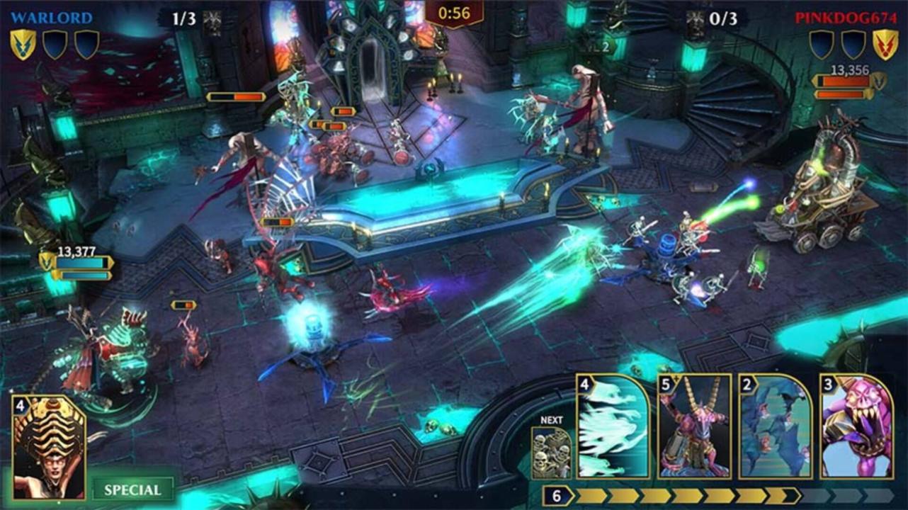 Fight and battle in an ultimate action pvp challenge to rule the Mortal Realms. Amass an army of powerful cards including Generals, Heroes and Summons. Collect cards, level them up and use their power to crush your opponents on the battlegrounds of the arena. Choose from many unique cards to create your own deck strategies. Deploy your powerful units to the battlefield and send them to combat. Enhance your tactics by deciding when to unleash legendary game changing General and Hero Special Powers, designed to combine with infinite potential. Send your heroes to take control of the mighty Realmgate and boost your deck with unique and super powered cards. These legendary magic cards can be played without cost, so choose your moment wisely.