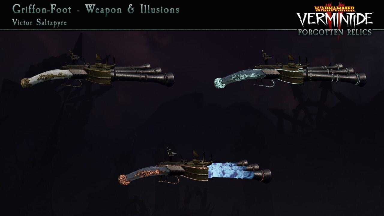 The Forgotten Relics Pack is a weapon and cosmetic pack containing the following items:5 new weapons.4 new paintings.1 new portrait frame.