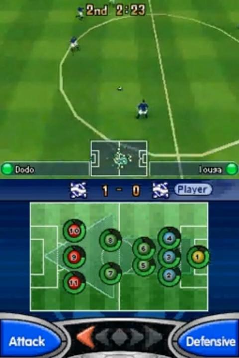 The Nintendo DS version of Winning Eleven: Pro Evolution Soccer 2007 includes gameplay modes like Exhibition Matches, World Tour (where players guide a team through matches against national teams), and a Cup competition. It features 57 national teams and 10 licensed clubs, though some player names are fictional due to licensing. The game supports local multiplayer via the Nintendo DS's wireless capabilities but does not include online play through the Nintendo Wi-Fi Connection. The controls are adapted for the DS, utilizing the directional pad and buttons without significant touchscreen integration.