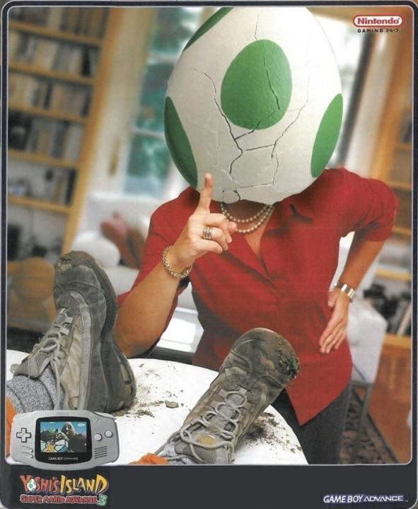 In Yoshi Topsy-Turvy, Yoshi Island has been turned into a picture book. Yoshi will not stand for this outlandish attempt at flattening his world, and he heads off on an adventure to return things back to their original state. To help in on his quest, a group of spirits who like to surprise people give Yoshi the ability to rotate the world to his liking. The big catch with Yoshi Topsy-Turvy is its use of a motion sensor, similar to the one set to be featured in the second Wario Ware GBA game. The game cartridge includes a built in motion sensor which detects how you move the GBA system. By turning the system, you make the world rotate. A meter on the upper right corner of the screen shows which way the system is being held at any time. Rotate the system to help Yoshi stay on the path and make it past perils and through the varied stages. Go full tilt! By tilting your Game Boy Advance, you'll tilt the environment around Yoshi, knocking over enemies, swinging pendulums, and letting Yoshi run up walls and leap huge pits! Will this ending be happy? All of Yoshi's Island is trapped in a storybook, and only by meeting the challenges of each chapter will you succeed. Collect coins, defeat enemies, or race for the finish to satisfy each course's conditions